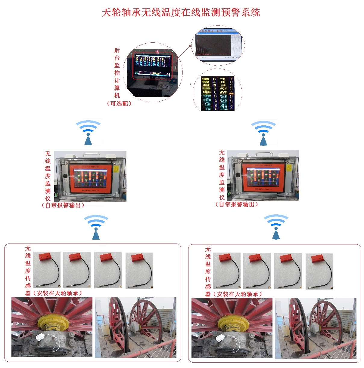天輪軸承上安裝的無(wú)線溫度傳感器以1次/3分鐘的頻率發(fā)射所測(cè)量的溫度信號(hào),無(wú)線溫度監(jiān)測(cè)儀實(shí)時(shí)掃描并接收范圍內(nèi)的所有溫度值并顯示在屏幕上,超溫測(cè)點(diǎn)予以報(bào)警。每個(gè)測(cè)點(diǎn)在屏幕上都有唯一的準(zhǔn)確的名稱(如:1號(hào)天輪左側(cè)軸承,2號(hào)天輪右側(cè)軸承等),如果安裝后臺(tái)監(jiān)控系統(tǒng),則無(wú)線溫度監(jiān)測(cè)儀同時(shí)通過(guò)無(wú)線485把數(shù)據(jù)實(shí)時(shí)傳輸?shù)胶笈_(tái)監(jiān)控計(jì)算機(jī),以便于監(jiān)控人員及時(shí)了解所有測(cè)點(diǎn)溫度情況。